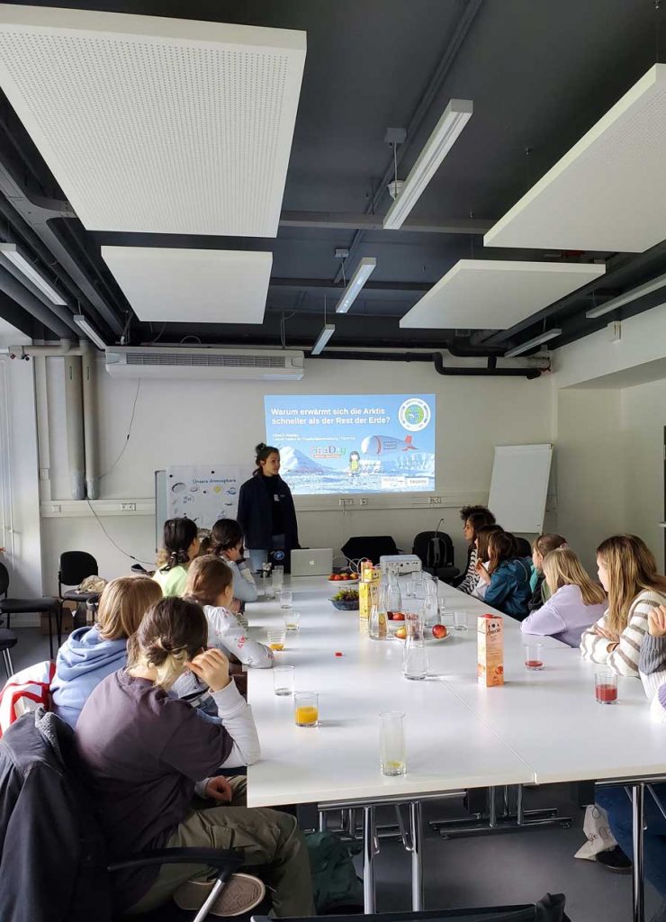 As part of the Public Climate School – An open university for all! our (AC)³ members Elena and Heike, together with Robert and Teresa, gave a lecture in English in the lecture hall of the University of Leipzig on the topic “Arctic Amplification – Why is the Arctioc warming faster than the rest of the planet and why I schould care”.