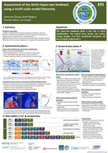 E01 has shown, that the total feedback in the Arctic in many global circulation models leads to a local runaway climate, due to the surface albedo and lapse rate feedback mechanisms (Block et al., 2020). The lapse rate feedback is strongest in boreal winter over sea ice and land, and is related to the temperature inversion strength (Lauer et al., 2019). Furthermore, the ICON modelling system has been thoroughly tested against observations in the Arctic (Neggers et al., 2019), and is ready for use in studies of feedback mechanisms in Arctic climate during phase II.